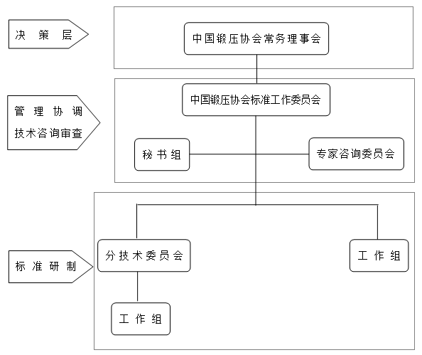 鍛壓協(xié)會(huì)團(tuán)體標(biāo)準(zhǔn)組織機(jī)構(gòu)包括實(shí)現(xiàn)標(biāo)準(zhǔn)化決策功能、標(biāo)準(zhǔn)化工作管理協(xié)調(diào)功能和標(biāo)準(zhǔn)研制功能的三級(jí)工作體系。具體設(shè)置為:中國(guó)鍛壓協(xié)會(huì)常務(wù)理事會(huì);中國(guó)鍛壓協(xié)會(huì)標(biāo)準(zhǔn)委員會(huì),下設(shè)秘書(shū)組、專家咨詢委員會(huì)(簡(jiǎn)稱專家委);各分技術(shù)委員會(huì)和工作組(簡(jiǎn)稱分支機(jī)構(gòu))。